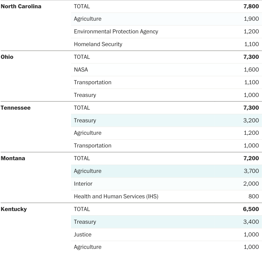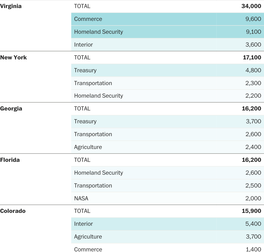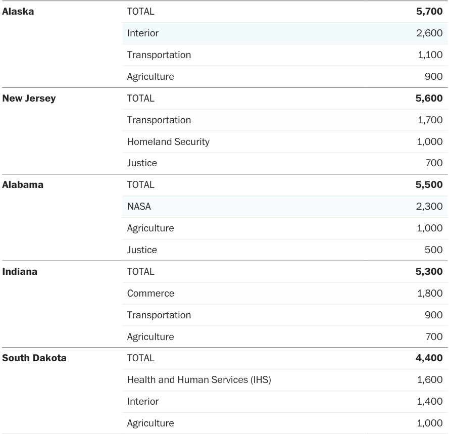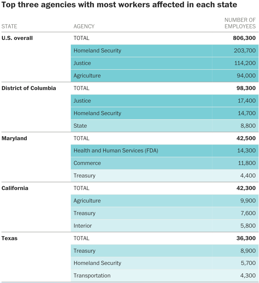 以下的圖表則說明了美國各州有最多聯邦工作人員受影響的政府部門及人數:
