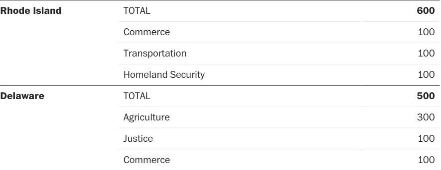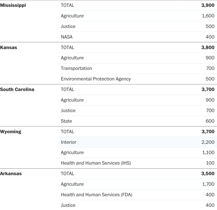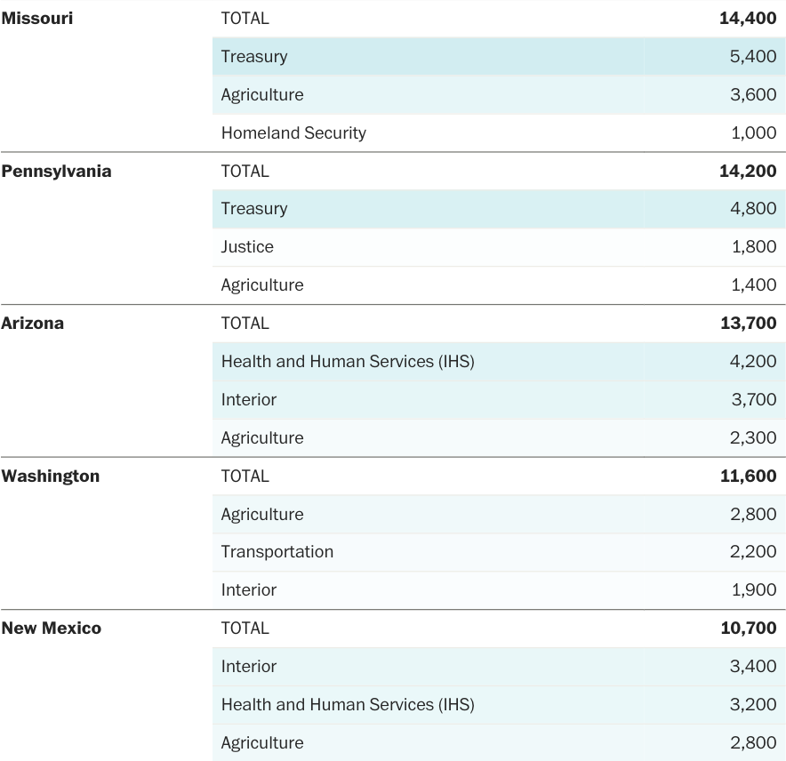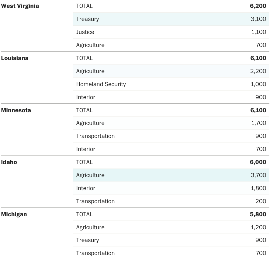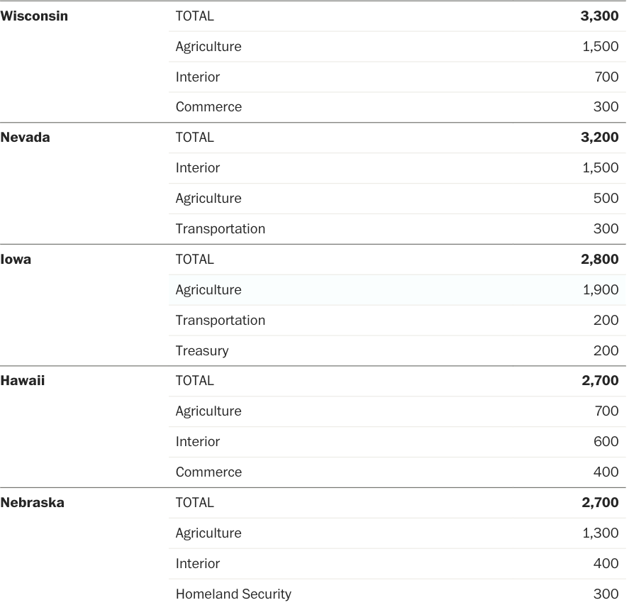 以下的圖表則說明了美國各州有最多聯邦工作人員受影響的政府部門及人數: