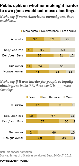 每次在大屠殺槍擊案後,美國人總會開始討論槍枝法規。然而,美國人對於法規改變是否能降低大屠殺保持分歧的態度。47%的成年人表示如果人們更難合法拿到槍,則大屠殺會減少些;而另外一部分的人46%的人表示如果人們更難合法拿到槍,則大屠殺會更多。