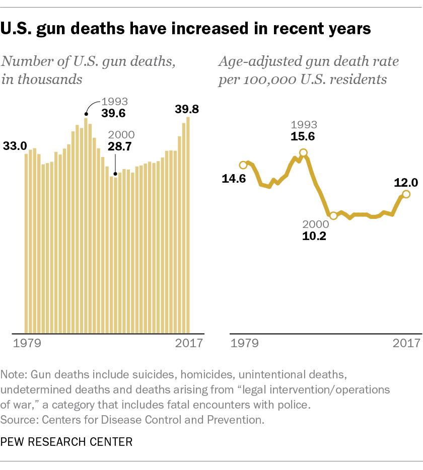 大約有4萬名美國人在2017年死於槍支相關事件,從2012年以來上升了19%。槍支死亡在五年內的增長原因包括使用槍枝自殺上升15%、使用槍枝或其他武器殺人上升25%。