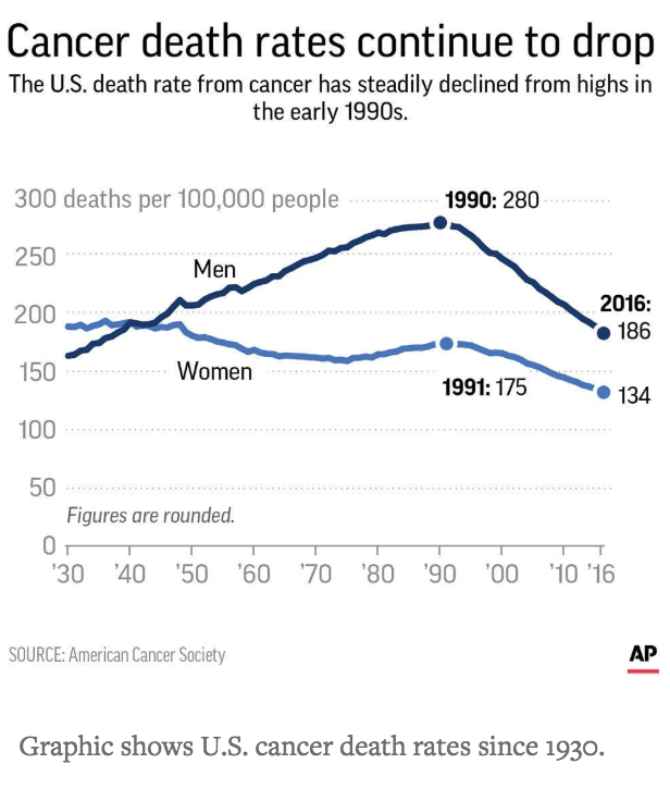 美國癌症死亡率於1990年代達到高點,然後就開始一路下降,從1991年至2016年間共降低了27%。而如此明顯的降低趨勢和肺癌有關。肺癌是每年害死最多人的癌症,特別是男性。 不過,和1991年相比,目前的肺癌死亡率已經驟降了將近50%,這可能和自1960年代起減少抽菸的趨勢有關。