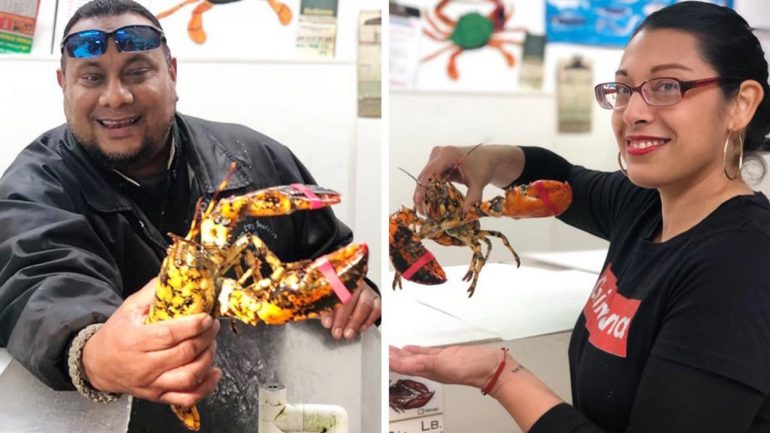 這隻在12月21日Ocean市被抓到的海鮮是一隻藍紋龍蝦。根據海洋生物龍蝦機構,這樣的甲殼動物被發現的機率大約是3000萬分之一。