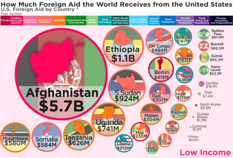 阿富汗和伊拉克之所以會得到最多金援,主要是因為美軍軍事部署的關係。美國的外援分配得並不平均,82%的美國國際開發署經費都給了其中30個國家,而另外的121個國家收到的金額則各不超過1億美元。
