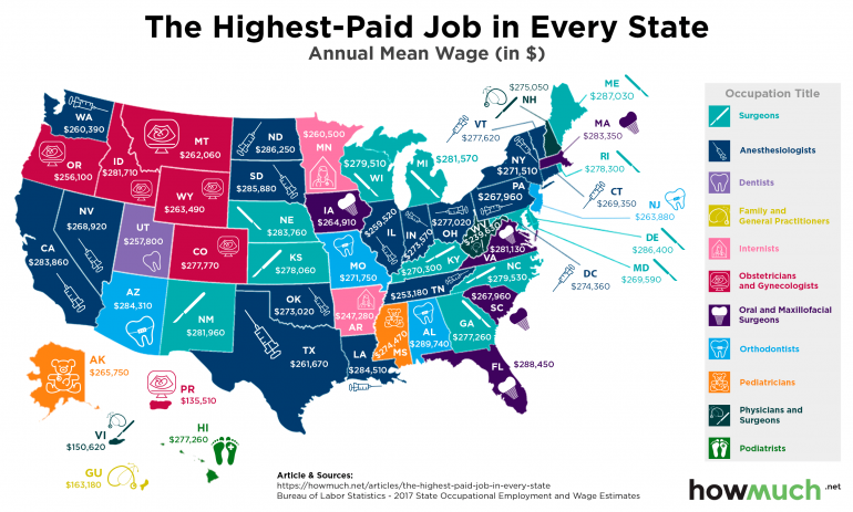 綜觀來看,醫師不管住在哪個州,薪水都是相對高的。除了波多黎各、美屬維京群島以及關島外,其他地區的最高薪職業平均收入都大約在25萬美元至39萬美元之間。