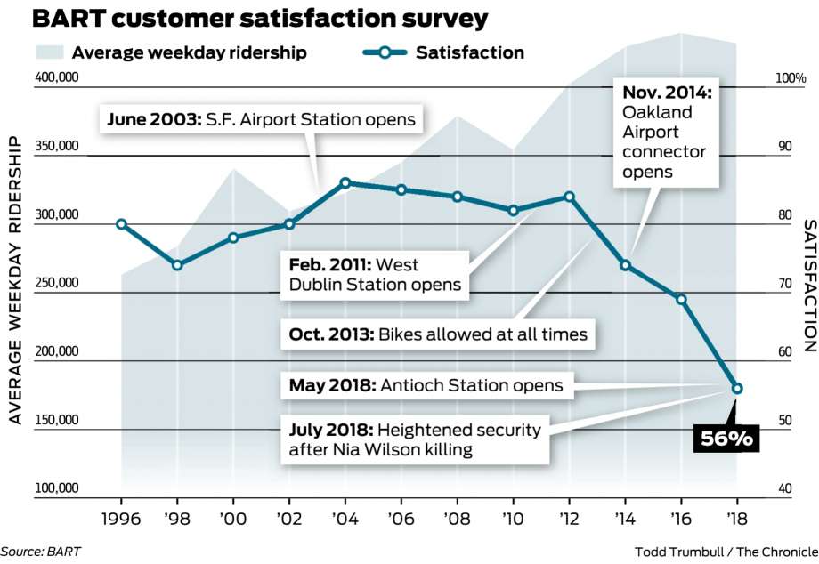 從 2016 年起,BART 系統在各個層面的滿意度就直直下降。對於防堵逃票(fare cheat)的滿意度暴跌了 20%,個人安全性滿意度下降 16%,而對站內警察人數的滿意度也掉了 15%。BART 總裁達菲提(Bevan Dufty)表示,雖然目前 BART 正在努力改革,但負面印象已經行之有年,非常難以改變。