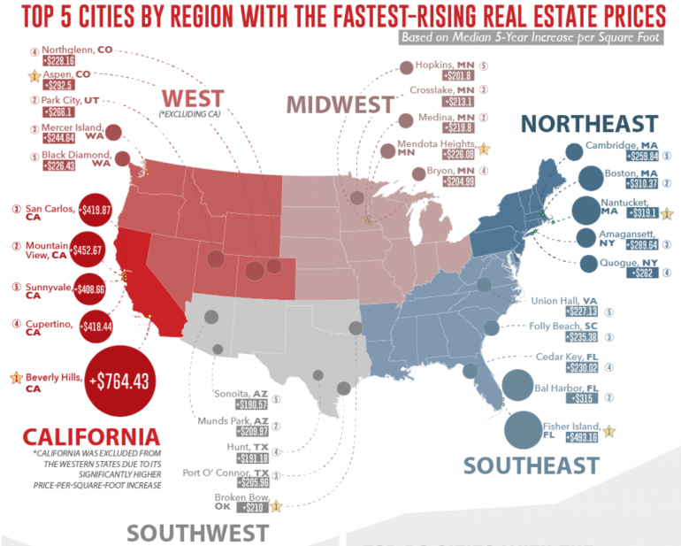 根據 5 年間每平方公尺房價中位數的增減,TitleMax 製作了圖表來顯示美國各地區的房價漲幅比較。