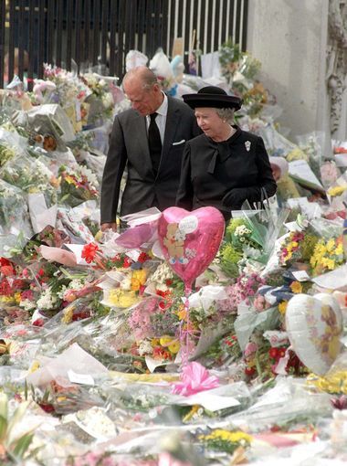 伊麗莎白二世(Elizabeth II)與愛丁堡公爵菲利普親王(Prince Philip, Duke of Edinburgh)於 1997 年 9 月 5 號來到白金漢宮旁的花海。