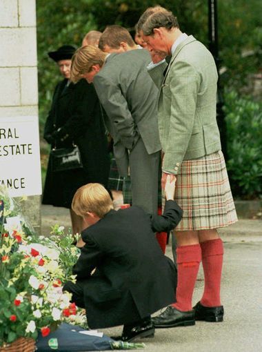 二十年前的小哈利牽著他爸爸查爾斯王子的手,佇足於巴摩拉城堡供品花的前面。