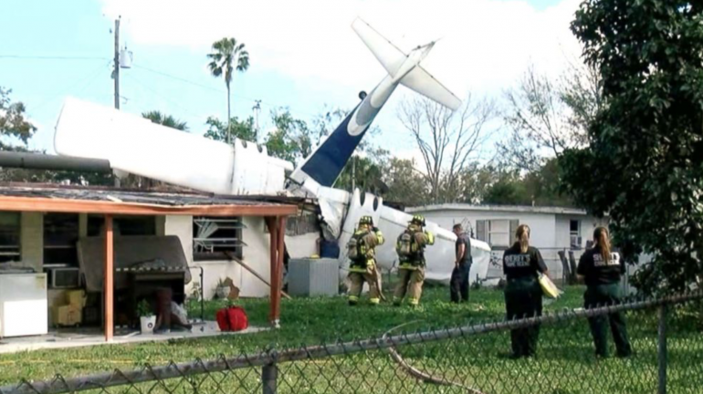 上週日,一架飛機從天而降,直闖佛羅里達州一處民宅,從屋頂飛進去,所幸家中人員即時逃逸。飛機上的飛行員當場死亡,而訓練駕駛以及民宅內共8名人員都即時逃離,只受輕傷。