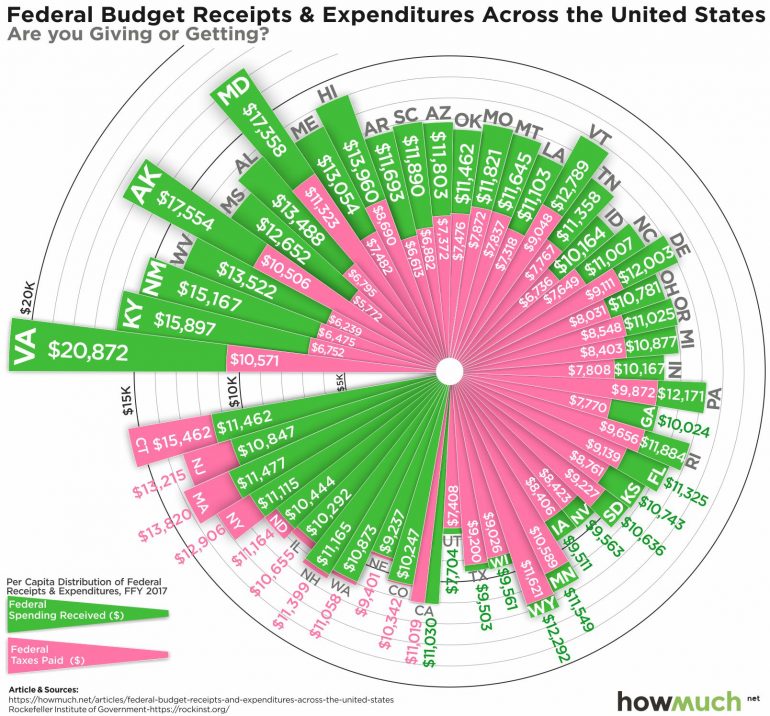 此資料來自於 SUNY Rockefeller 2019關於財政政策的報告。該報告打破過往報告只顯示在各州的人付給聯邦多少錢,也加入聯邦花了多少錢在各州上。花費包含了不一樣的種類,包含直接付給民眾的社會保障、給當地政府的合約和聯邦員工薪水等。我們按照順時鐘方向從高到低列出圖表,分別顯示出各州民眾繳交的稅金與聯邦花在該州的金額。