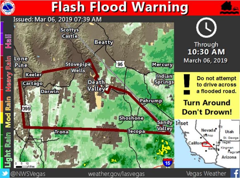 在通常整個三月份,死亡谷的Furnace 小溪通常會有0.3英吋的雨量。而在這星期二到星期三的24小時內,竟然達到0.84英吋的雨量。國家氣象局也預測附近山區有1到1.5英吋的雨量。