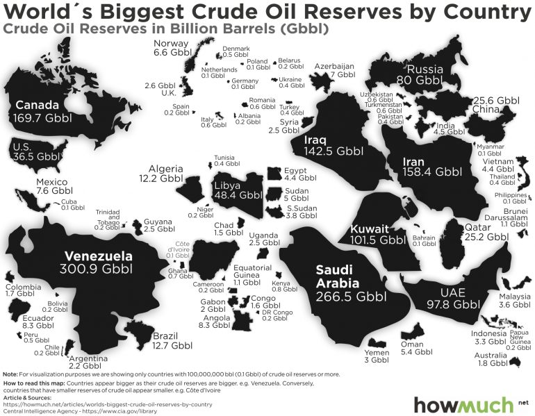 上榜的一半國家中,有一半在中東、北非地區。其中有6個國家是OPEC成員:Venezuela、Saudi Arabia、Iran、Iraq、Kuwait 和 Libya。而國家的面積大小與石油存量似乎沒有正相關。舉例來說,科威特土地僅有17,818 平方公里,但卻有101.5 Gbbl的石油儲量。而俄國雖然是科威特的土地十倍大,但僅有80Gbbl的儲量。