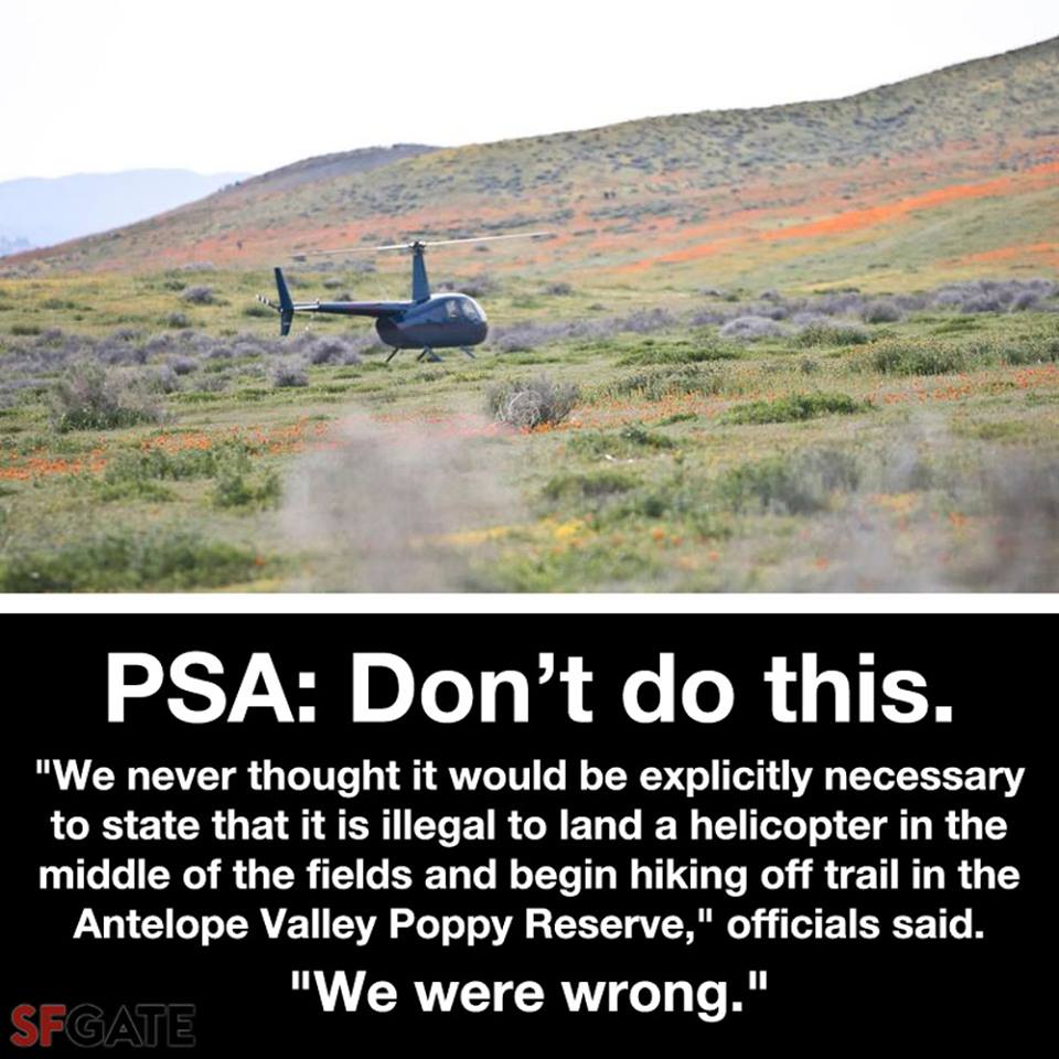 「我們從未想過要跟大家特別聲明:不能夠在羚羊谷罌粟花保護區降落飛機、然後還在裡面行走。」他們在臉書上寫下此貼文,並同時標記Hashtag「#Don’tDoomTheBloom」。