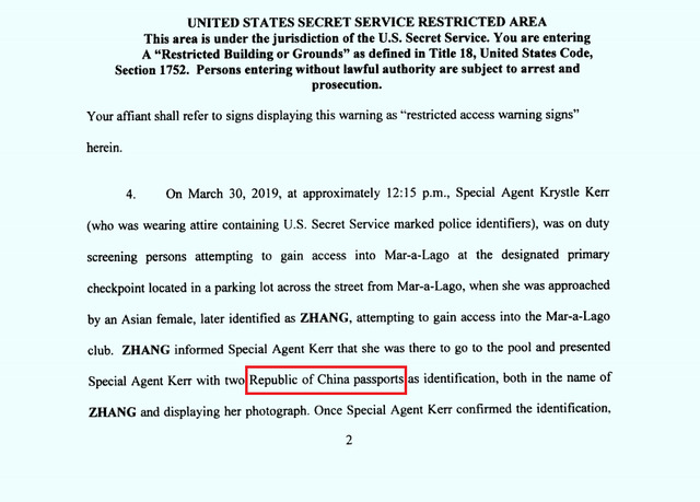 上週,川普在佛羅里達州棕櫚灘 Mar-a-Lago 私人俱樂部度假時,一名帶有兩本中國護照和惡意電腦軟體裝置的女子試圖擅自闖入,之後遭到逮補。然而,事件發生後,法院文件將「中國(People’s Republic of China)」誤植成「中華民國(Republic of China)」。