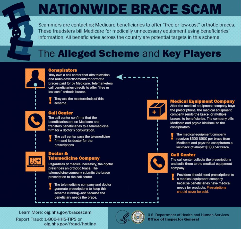 這些電話推銷的據點大多分佈在菲律賓和拉丁美洲,主要下手目標為保了聯邦醫療保險的美國老人。這些詐騙份子會透過電視、收音機廣告或電話來推銷,強調他們公司有提供「免費或低價」的背部、肩部、手腕或膝蓋支架(brace)。