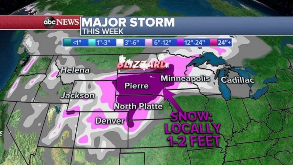 這場風暴會在禮拜四往北美大平原地區推進。丹佛的降雪應該到了週四就會停止,不過在內布拉斯加州、南達科他州,和明尼蘇達州西部則仍會持續下雪,直到風暴在這週末離開本區為止。