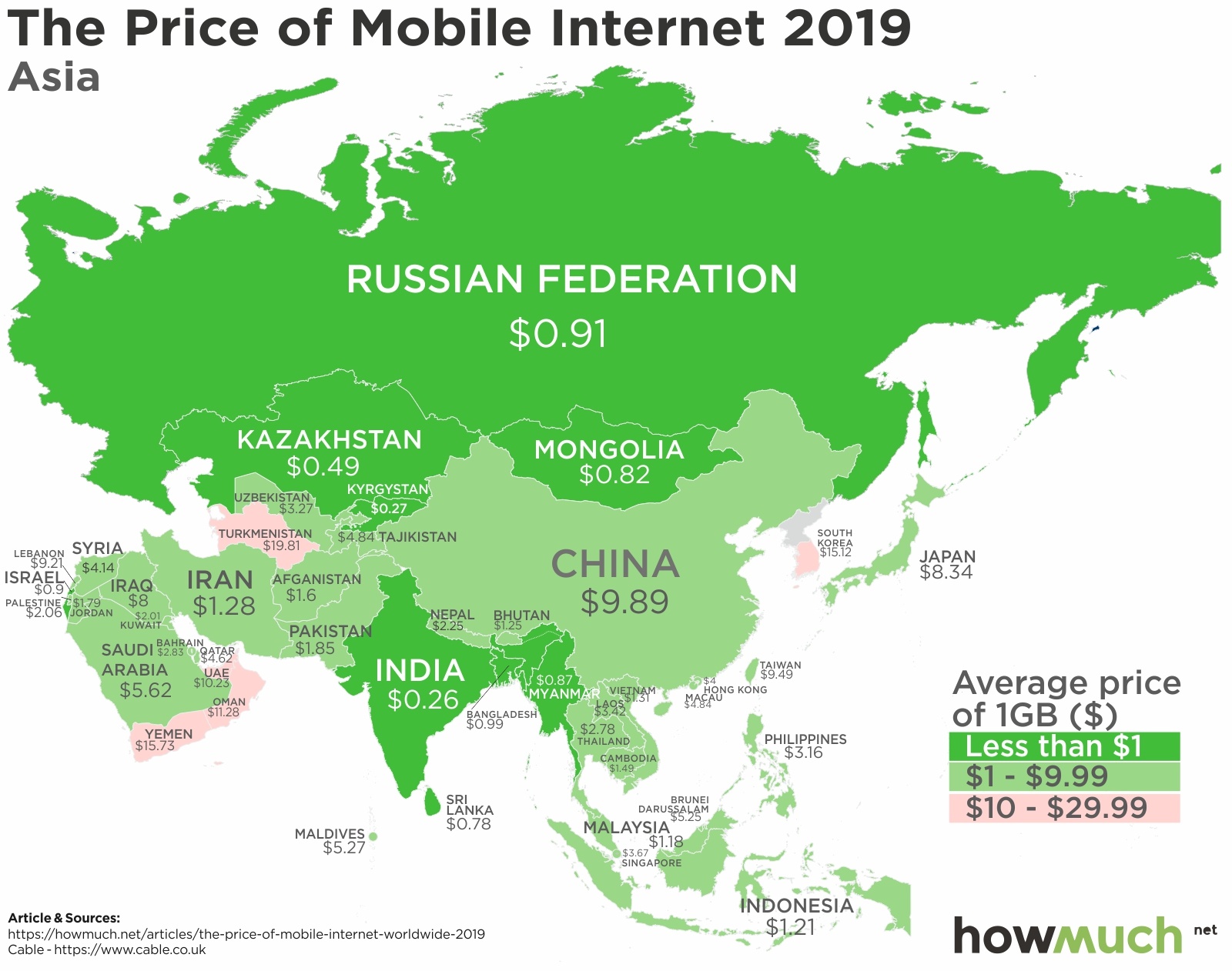 在亞洲地區,位在中東和東亞部分國家的網路費用相較之下高了許多。全亞洲網路費用最貴的國家是土庫曼(Turkmenistan),平均每 1GB 的網路就要 19.81 美元。而網路最便宜的國家則是印度,平均只要 0.26 美元。在南亞、中亞和東南亞國家的網路費用,大多低於 5 美元。