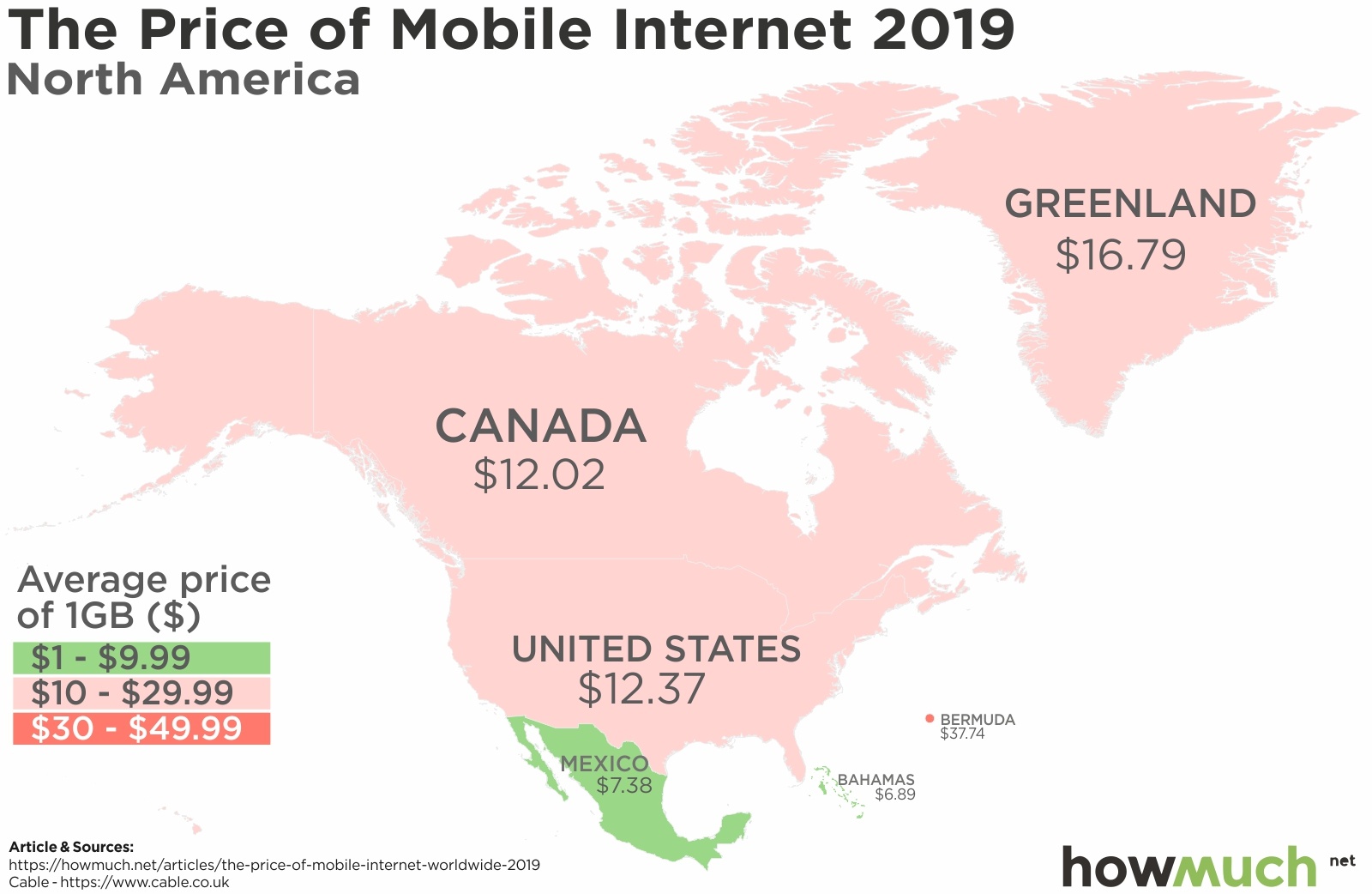 在位於北美的國家中,沒有一個國家的 1GB 網路費用是低於 5 美元的,讓北美成了全球網路最昂貴的區域之一。百慕達(Bermuda)是北美中費率最貴的地方,1GB 的網路就平均要價 37.74 美元,而巴哈馬則是網路最便宜的國家,只要 6.89 美元。智慧型手機持有率達到 77% 的美國,平均 1GB 網路費用則是 12.37 美元。