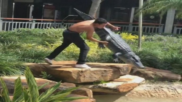 在影片中可以看到,這名青年先是把他的衣服給脫掉,接著就跳過圍欄,並把展示區的假鱷魚從石頭上往水池裡丟。接著,他用摔角招式「R.K.O.」攻擊了那隻假鱷魚,還作勢壓制了它。