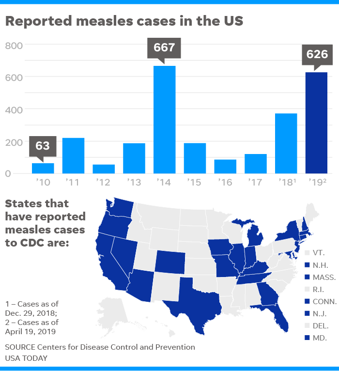 星期一,疾病管制局(CDC)報告上週麻疹病例增加71起,從2019年1月1日開始已在全美22州爆發626起。此數據也是從2000年官方宣稱麻疹被消除後最高的數字。