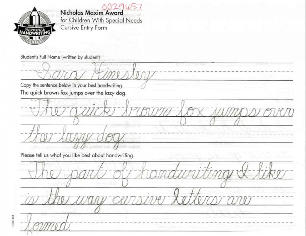 海恩斯莉(Sara Hinesley)是一名馬里蘭州的小三學生,她在 2019 年的 Zaner-Bloser 國家書寫比賽中,贏得了尼可拉斯・馬克西姆獎(Nicholas Maxim Award)。只有患有智力、生理或發展障礙的學生,才能參選這個獎項。