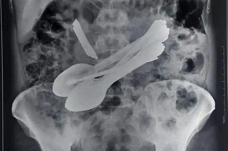 一名印度男子在因為疼痛而就醫後,就被緊急送往手術房,因為醫生不但在他的胃裡發現許多異物,其中一把他吞下的刀子還已經開始刺穿他的胃壁了。