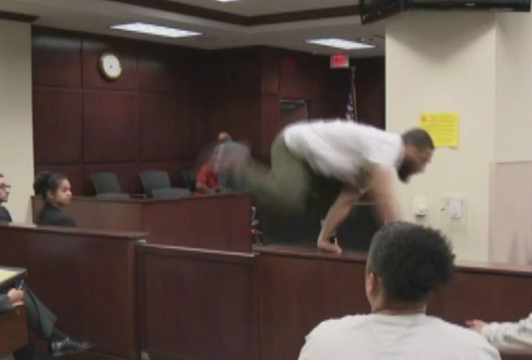 在 MLive.com 獲得的法庭影片中,被害者的兒子 London Thomas 似乎太過生氣,從他的座位上跳了起來,並跳過障礙來攻擊正在與公設辯護人說話的 Flowers。