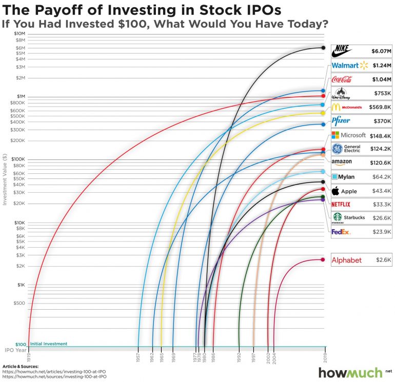 數據分析網站 HowMuch 為此做了一個小實驗,並將結果圖像化(若首圖文字太小,可點擊這裡查看原圖):假設你可以回到過去,並於現今一些知名大公司在首次公開募股時,就投入 100 美元的話,你當初的投資現在會值多少錢呢?
