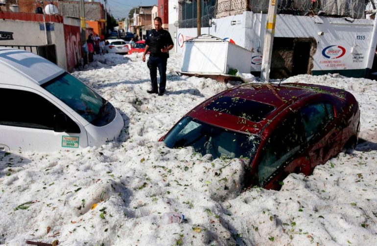 墨西哥第二大城瓜達拉哈拉(Guadalajara)及特拉克帕克(Tlaquepaque)的部分地區,地面看起來就像是下了雪般地一片雪白,但其實這是因為,這兩個地區才剛面臨了一場大型的雹暴(hailstorm),街道都被厚重的冰雹給覆蓋住了。