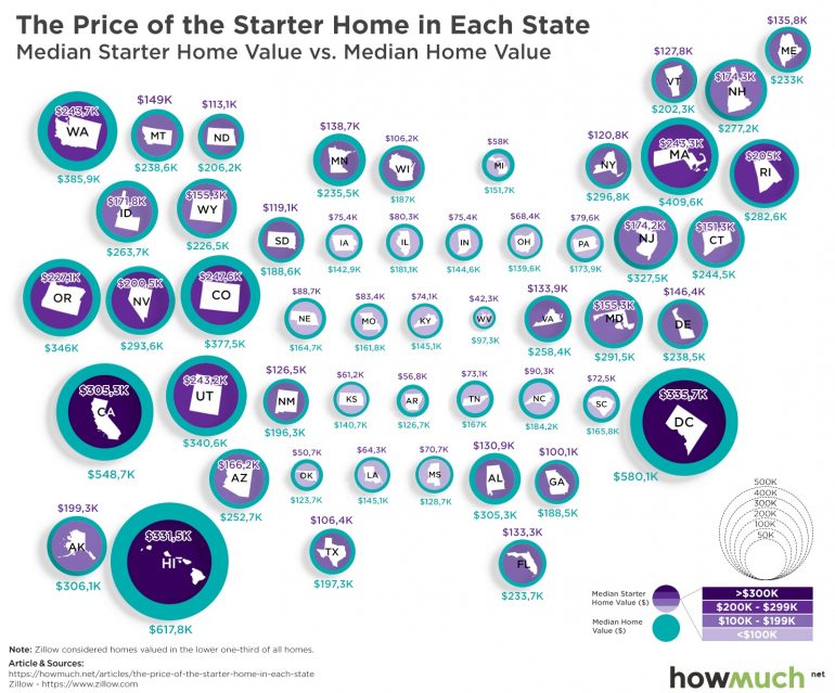 擁有一個自己的房子是許多美國人的夢想。不過,在有能力買下夢想中的房子以前,許多首購族都會先從「起步房」(starter home)買起。而這張圖表就呈現了美國各州起步房價格的中位數,以及和一般住宅的房價差距。(若首圖字太小,可點擊這裡查看原圖)