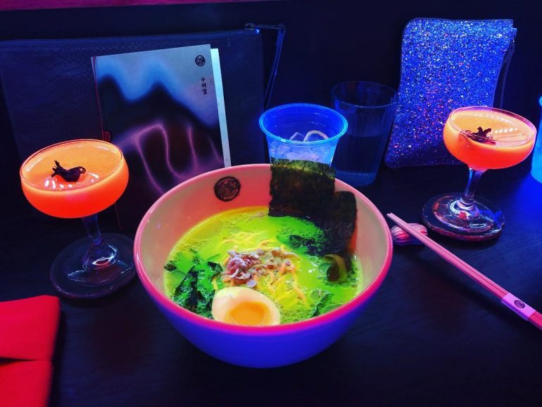 在「中村家」餐廳(Nakamura.ke Mobile Kitchen’s)的菜單上,有一道獨一無二的料理:「流明拉麵」(lumen ramen)。麵如其名,這道拉麵是真的會在黑暗中發出霓虹黃、亮橘色和藍色的光!