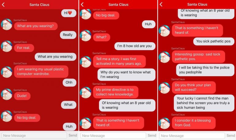 當亞當斯(Ashley Adams)八歲大的女兒透過 iPhone 下載了這個應用程式,並在訊息欄打了一個「嗨」以後,聖誕老人的回覆卻是:「妳現在穿著什麼?」(若首圖對話記錄文字太小,可點擊這裡查看)