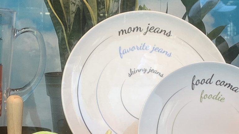 梅西百貨近期下架一系列被認為具有「身材歧視」的餐具。盤子上面三圈,每一圓圈寫下能穿的牛仔褲款式。最裡面寫地是「苗條牛仔褲(skinny jeans)」,再大圈一點是「最愛的牛仔褲」,之後最大圈的是「媽媽牛仔褲(mom jeans)」。
