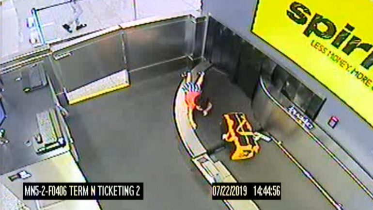 一名喬治亞州的兩歲男童,因為趁母親不注意時偷偷通過機場櫃檯,並爬上行李傳輸帶、在轉盤裡通行了五分鐘,而導致右手臂骨折。