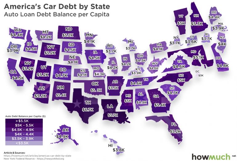 目前全國的每人平均車貸金額為 4,700 美元。在人均車貸金額最高的五個州中,就有四個是位在美國南部的州;而在人均車貸金額最低的五個州中,則有四個是位在美國東北部的州。