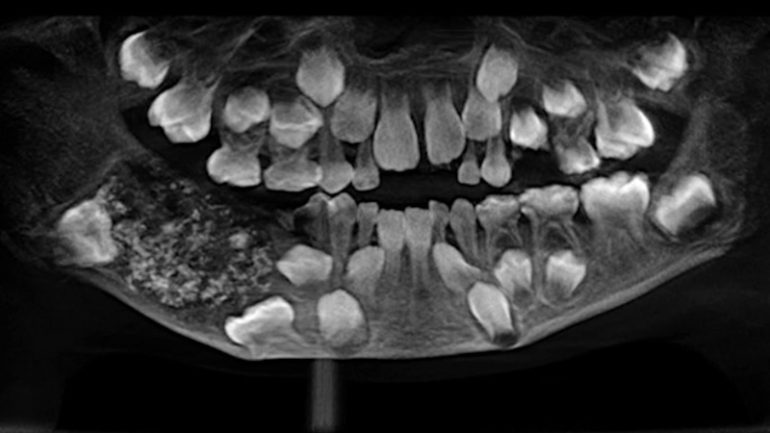 X光顯示男童的顯示下巴組織重達200公克,包含了526顆牙齒。