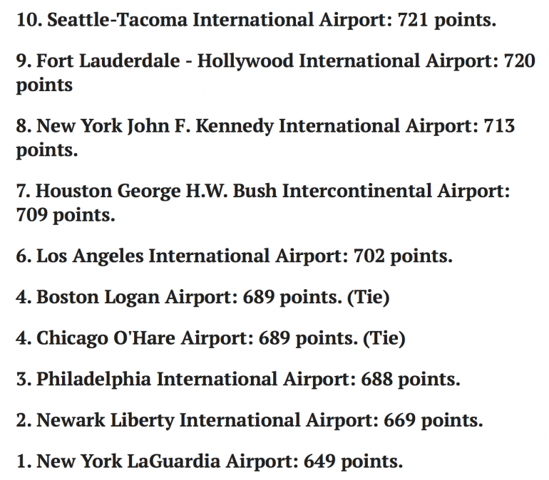 列表底部的機場是紐約拉瓜迪亞機場,得分為649分。研究公司總監Michael Taylor說:「目前這些終端每年處理1300多萬旅客,其設計只能處理800萬旅客。這種改進需要很長時間了,新的設計將為LaGuardia旅行者造成重大的短期困擾,但結果將是值得的,這個設計解決了機場的兩個主要問題:過度擁擠和使飛機更有效地在跑道上起飛。」