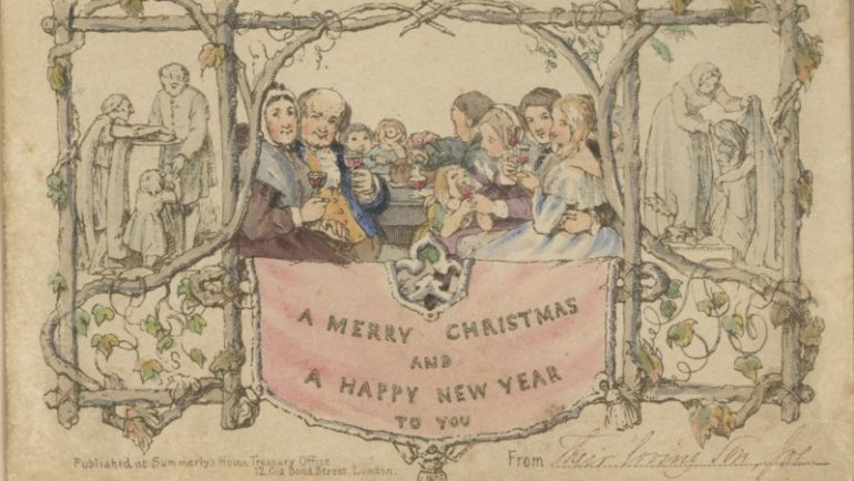 這張聖誕卡呈現出了最典型的聖誕節印象。在卡片中央,有一個家庭正在一起飲酒慶祝聖誕節,在這個家庭的後方,還有其他人在提供食物和衣服給窮人,以象徵聖誕節的慈善精神。