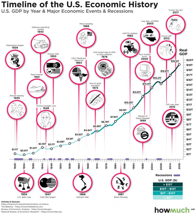 例如,美國 GDP 成長最多和降低最多的時期,都同樣是在 1930 和 1940 年代。經濟大蕭條時期重創了美國的經濟,不過二戰時期所帶起的經濟產出,也大幅提升了經濟表現。之後的韓戰、越戰,以及美國登月的阿波羅計畫,也都對美國經濟有著正面影響。