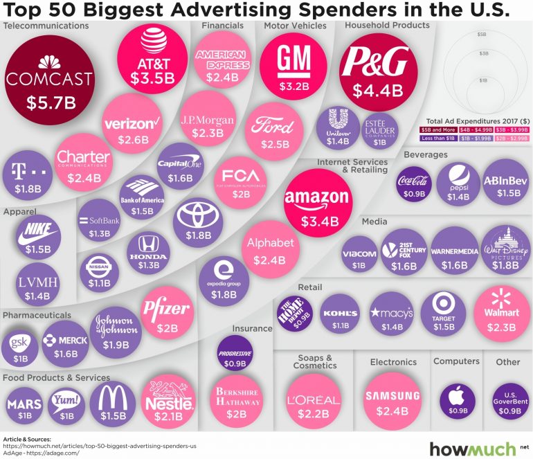 根據統計,在全球廣告花費最高的前 50 名公司中,就有 38 家的總部是位在美國。此外,2017 年,全球共有 41 家公司花了超過 10 億美元的經費在打廣告。