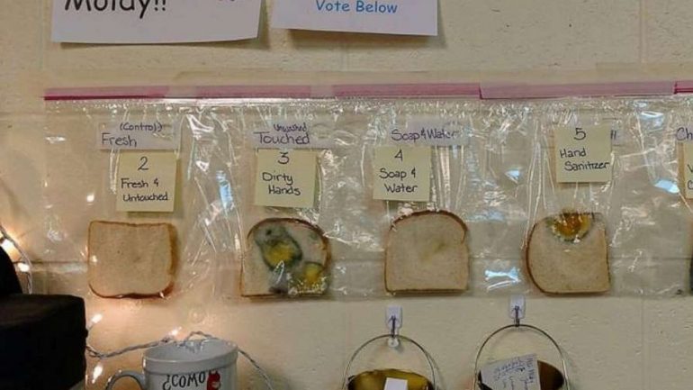 麥特考夫、特教老師羅伯森(Dayna Robertson)和所有的孩子們,一起將好幾片吐司放到密封袋裡。這些吐司分別都被學生用髒手、用肥皂和水洗過的手,以及用過乾洗手(hand sanitizer)的手所碰過。還有一片吐司是擦過教室內的電腦鍵盤的。