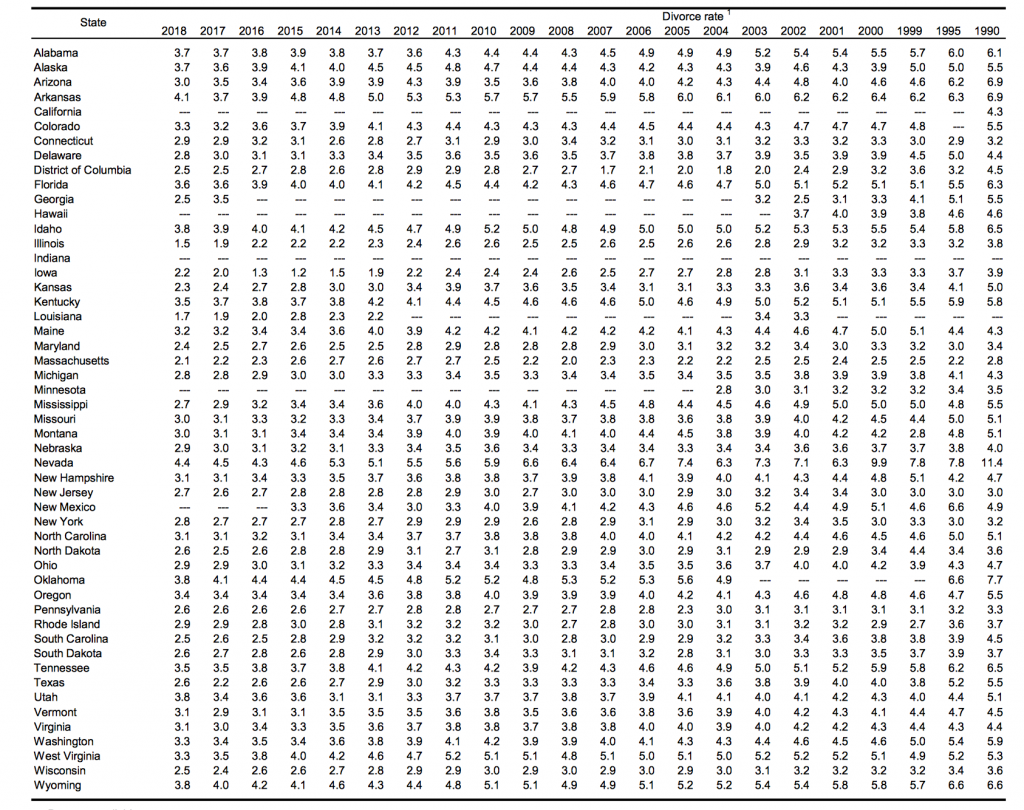 根據國家衛生統計中心的數據報告,以下是2018年以來,離婚率最高和最低的州(部分州未有最新資訊):