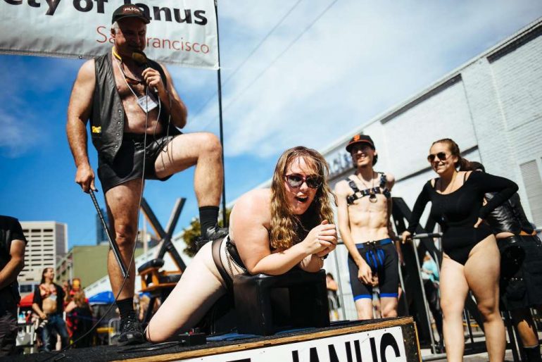 一群男人和女人穿著皮革、皮帶和內衣,等待著被鞭打,數百名觀眾在星期天Folsom Street Fair上觀看。
