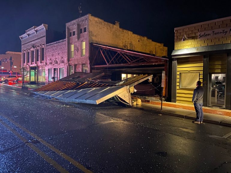 在印第安納州中部的 Mooresville 市中心部分地區受到風暴影響,大風(可能是龍捲風)摧毀了某棟廢棄建築的第二層樓,街道上佈滿了磚塊和碎片。在新型冠狀病毒大流行期間,印第安納州全居家隔離政策剛好使人們脫離風暴帶來的危險。Mooresville 市消防局科長 John Robinson 說:「我們市中心有些小餐館,在正常風暴情況下,人們會有危險。但幸運的是,由於新型冠狀病毒,每個人不在街上了。老實說,這真是不幸中的大幸。」