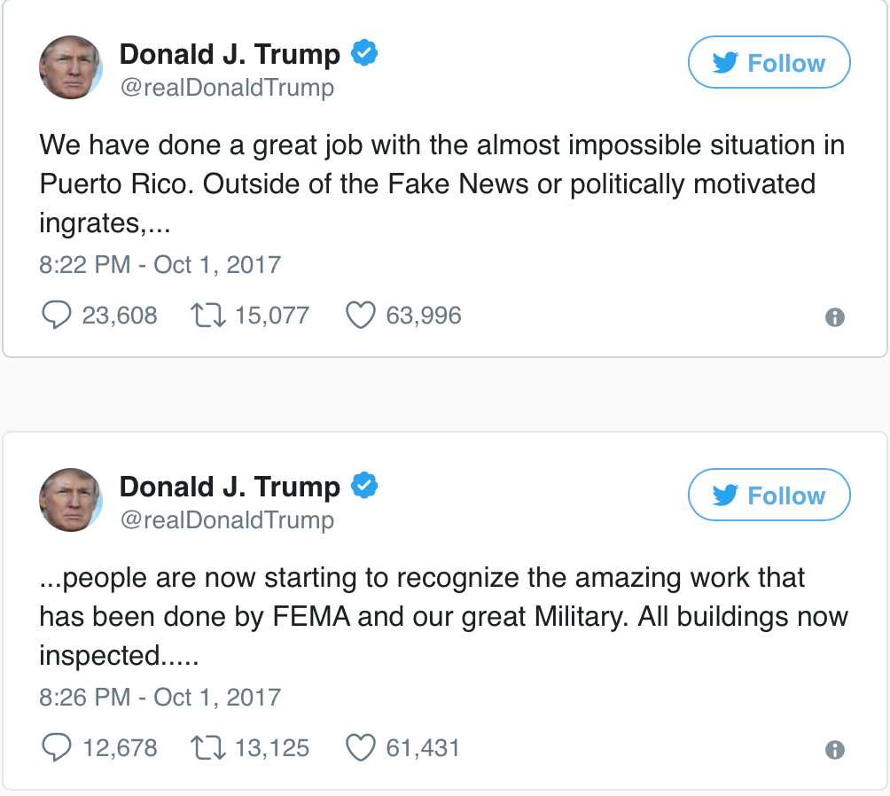 川普說:「在波多黎各十分困難的狀況下,我們做得非常好。在假新聞和政治陰謀之外,人們該知道FEMA和我們的軍隊做得多好。」