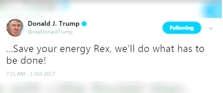 美國總統川普已經不是第一次公開反對國務卿雷克斯提樂森了,他在週日於推特上說提勒森試圖與金正恩談判是在浪費時間。針對北韓的核戰威脅,川普還建議道:「保留體力吧,雷克斯,該做什麼我們就會做什麼。」