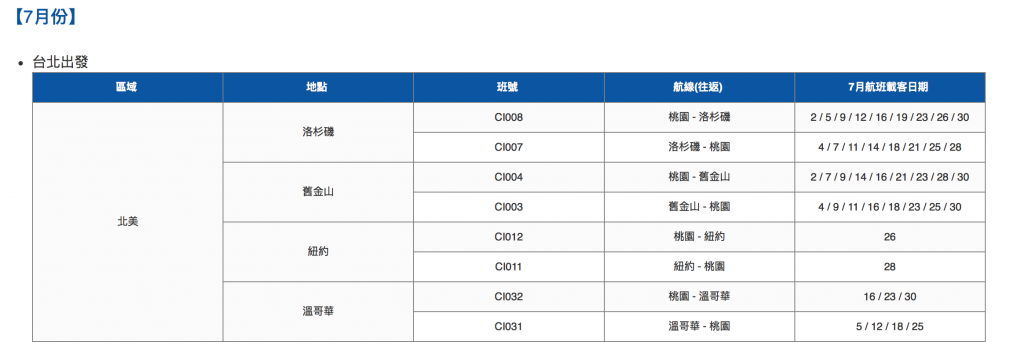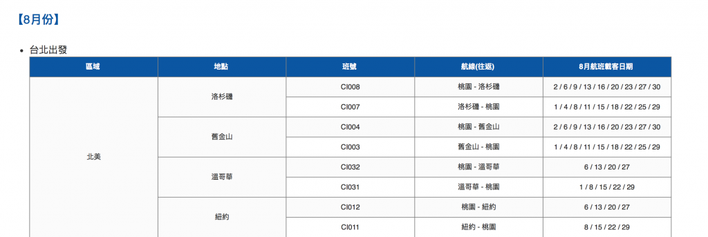 Home台北—紐約航線復航 華航7/26起重啟航班 旅遊 台北—紐約航線復航 華航7/26起重啟航班 15日,華航在官網宣布七、八月的最新航班資訊,7月26日起,原先停飛的台北—紐約航線將重啟。 根據華航官網最新公告,華航的全球航點共有160個、遍佈在29個國家或地區。以下是華航7月及8月的北美航線航班資訊: 資料來源:中華航空官網 留言 (Visited 605 times, 1 visits today) 分享此文:Tweet 相關 Jessica "Keep your eyes on the stars, and your feet on the ground.” - Teddy Roosevelt Share This Previous Article「沒有人想見到的一天」美國航空將裁25000名員工 Next ArticleYoutuber在加州海灘發免費口罩 路人拒絕:戴口罩會下地獄 2020-07-16