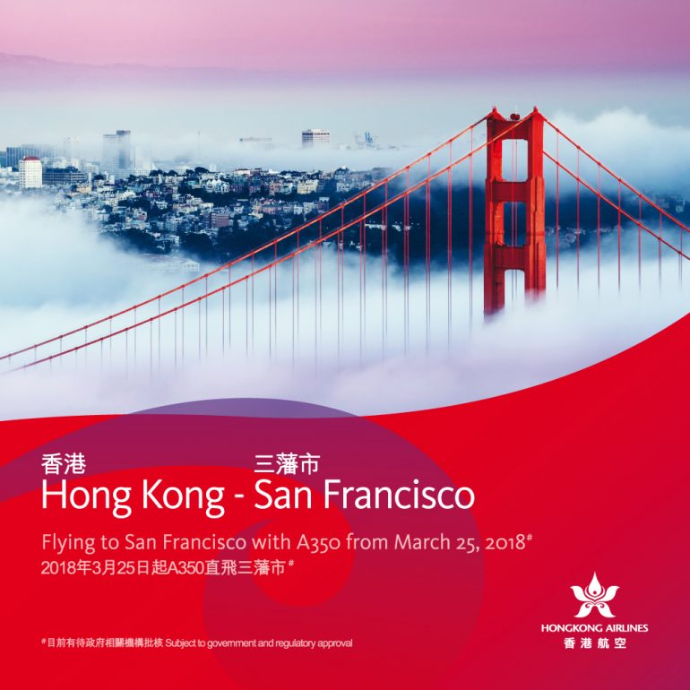 香港航空宣佈將由2018年3月25日起,正式開通美國舊金山直航服務。