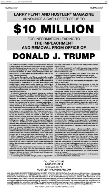 這篇廣告是由Larry Flynt發的,他最為人知曉的是色情雜誌Hustler發行人的身份,在廣告中他列出許多他認為川普必須下台的原因,包括:他利用自己的商業帝國巨大利益衝突來決定國內外政策、他講了數百個謊言、他利用裙帶關係任用不適任的人進入白宮等。基於這些原因,他需要有人可以提供資訊來成為彈劾川普所需要的鐵證。