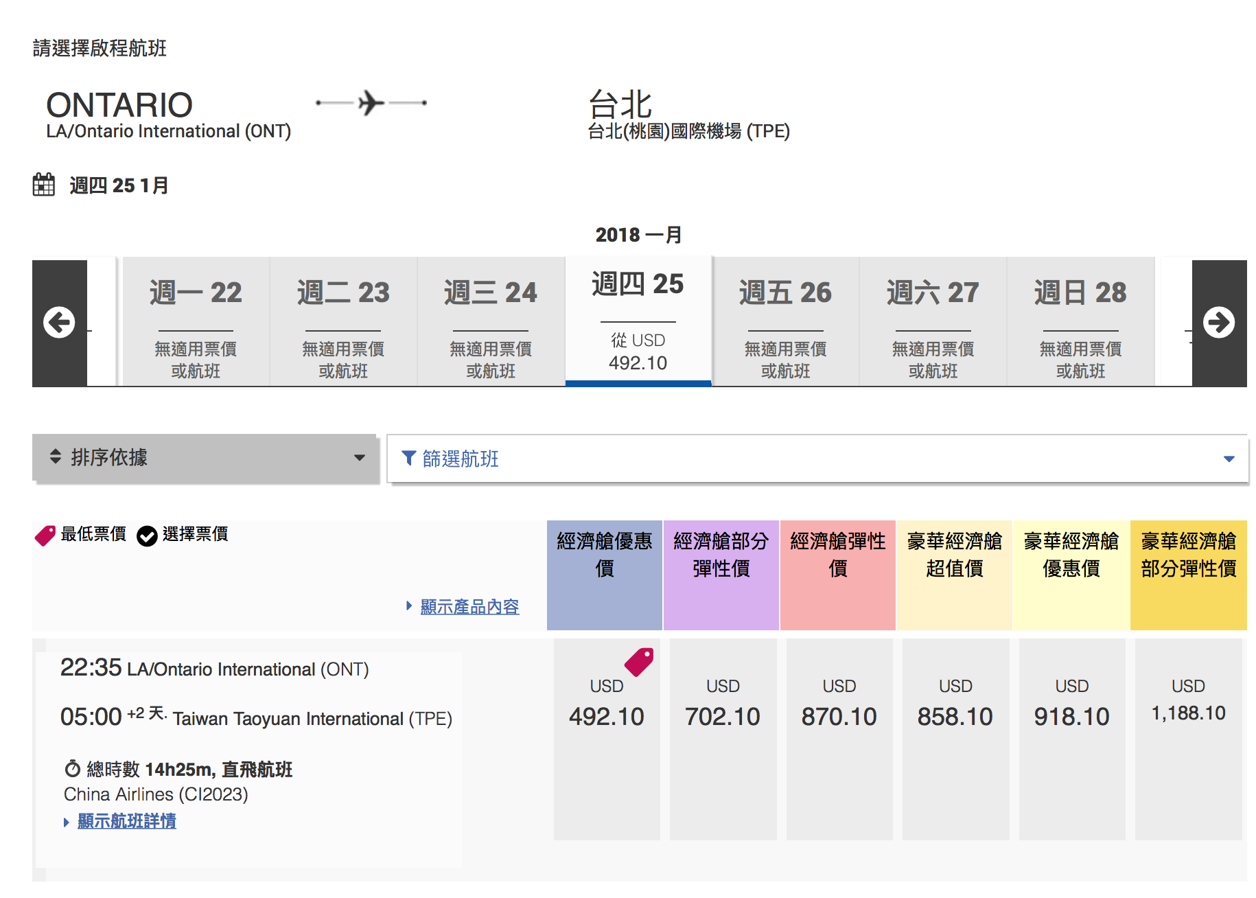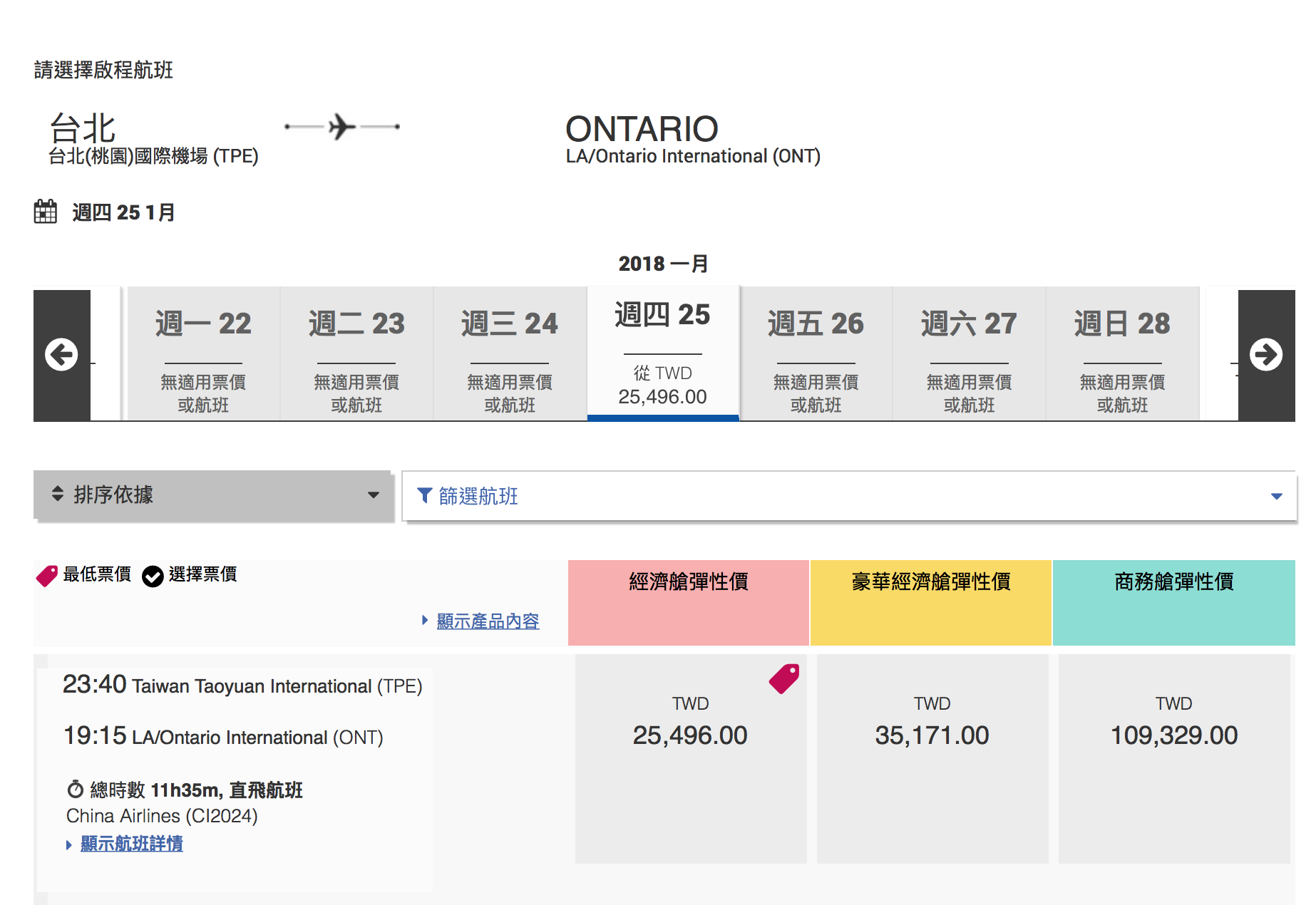 台北直飛安大略 $25,496起 ($842.87 USD)
